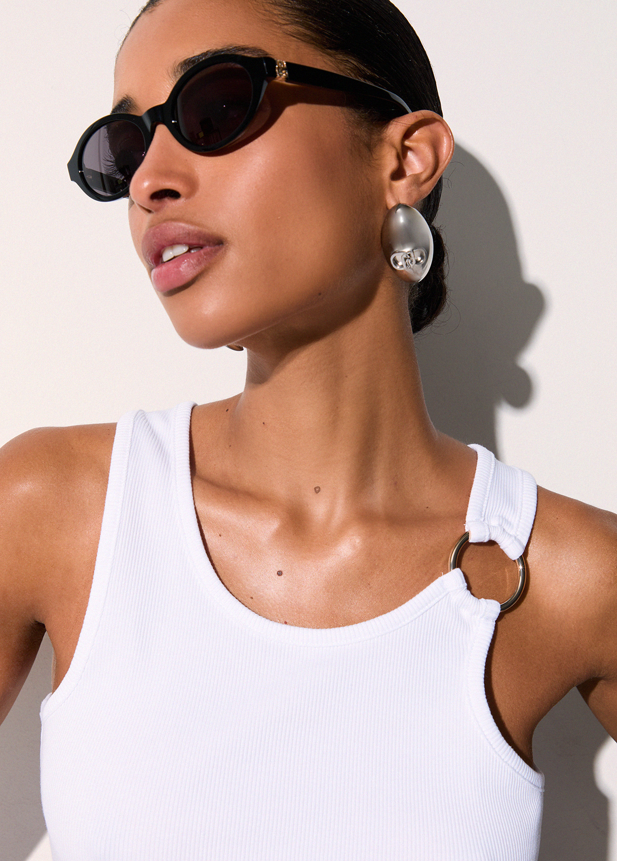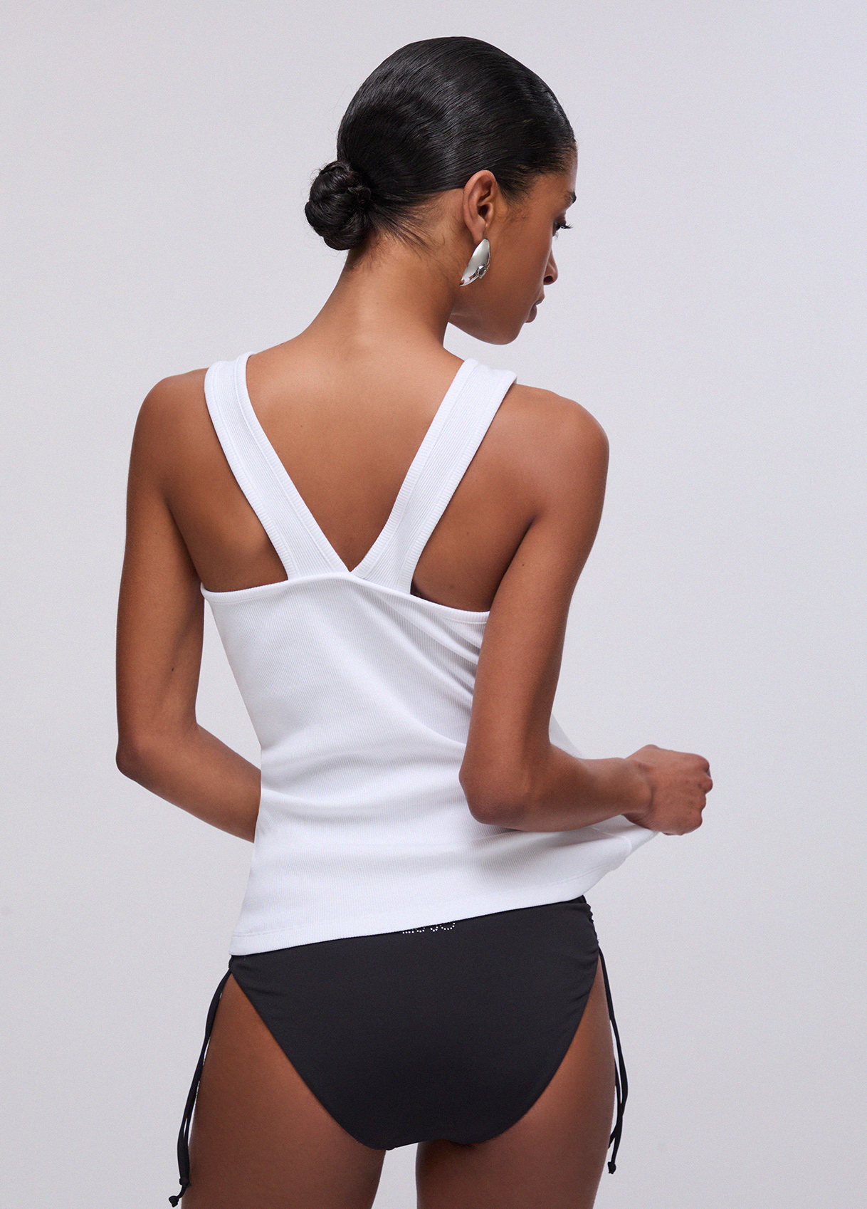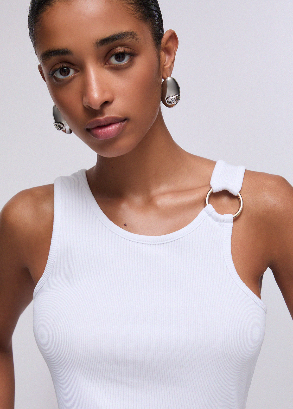 Βαμβακερό ζέρσεϊ τοπ, ριμπ πλέξη, λεπτομέρεια κρίκος, V λαιμόκοψη στο πίσω μέρος.