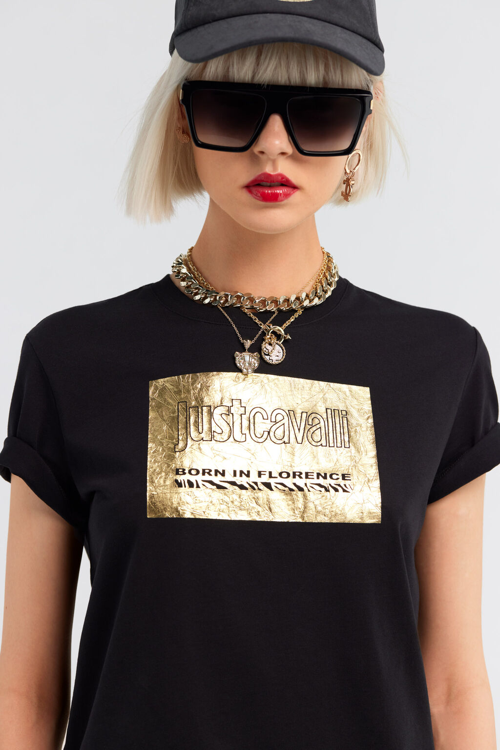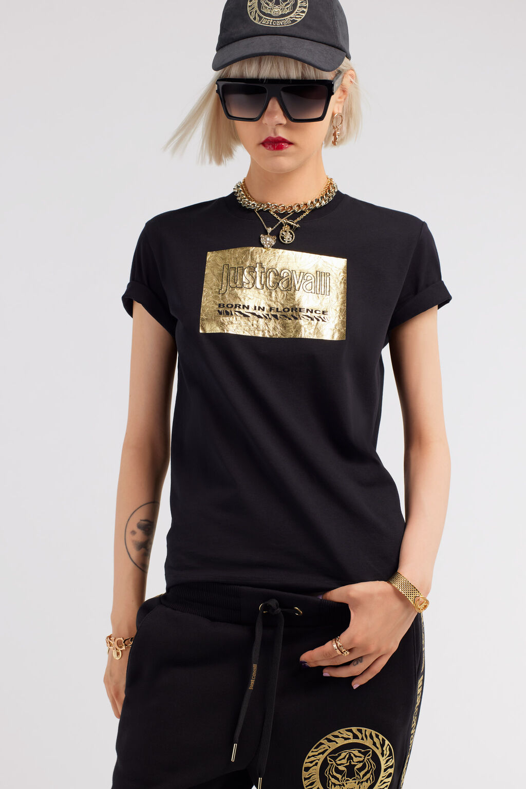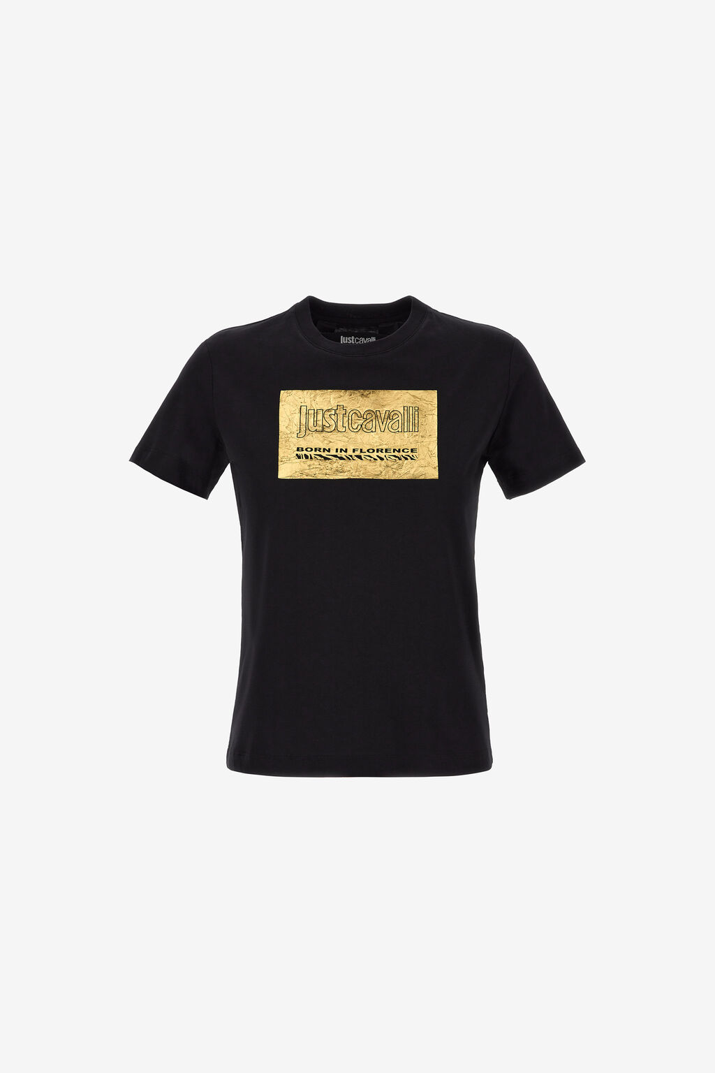 Κοντομάνικο μπλουζάκι με λαιμόκοψη και λογότυπο Just Cavalli στο μπροστινό μέρος με στάμπα σε χρυσό φόντο.