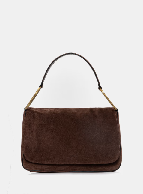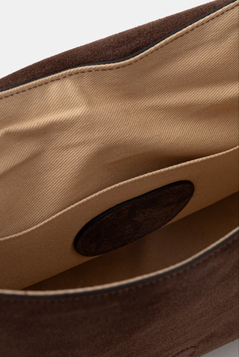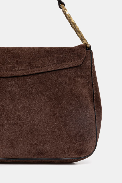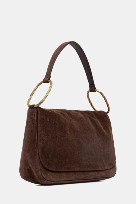 TWINSET τσάντα Liliane, κατασκευασμένη στην Ιταλία από σουέτ δέρμα με οβάλ κρίκους σε απόχρωση καφέ. Κλείνει με καπάκι και μαγνήτη, ασορτί λουράκι ώμου με δέρμα μοσχαριού από την κάτω πλευρά, θερμικά τυπωμένο λογότυπο στο μπροστινό μέρος.